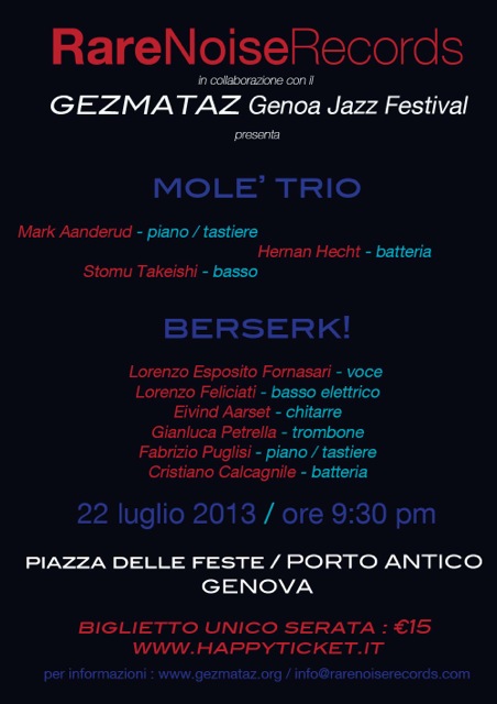Ore 21.30, Genova, Porto Antico, Piazza delle Feste - Biglietti € 15 - Sito web www.gezmataz.org (qui possibile prevendita dei biglietti) C’è dell’ottima musica jazz il prossimo 22 luglio, al Porto Antico. Si tratta della RareNoise Night, all’interno del “Gezmataz Genoa Jazz Festival”, prestigioso evento che vedrà tra suoi protagonisti artisti come Carla Bley, Esperanza Spalding, Geri Allen. La RareNoise Night del 22 luglio è una full immersion dedicata a “Rare Noise Records”, label anglo-italiana del jazz di confine , con sede a Londra e contatti costanti con il gotha della musica internazionale d’avanguardia. In questa serata saranno impegnati sul palcoscenico Mole’ Trio, di Mark Aanderud, Hernan Hecht e Stomu Takeishi , e Berserk!, formazione a cavallo fra il rock ed il jazz, dal cuore italiano, fortemente voluta da Lorenzo Esposito Fornasari, Lorenzo Feliciati e Gianluca Petrella, qui accompagnati da Eivind Aarset, Fabrizio Puglisi e Cristiano Calcagnile. http://www.rarenoiserecords.com/jukebox/berserk/berserk ) Clicca qui per vedere la locandina della serata.